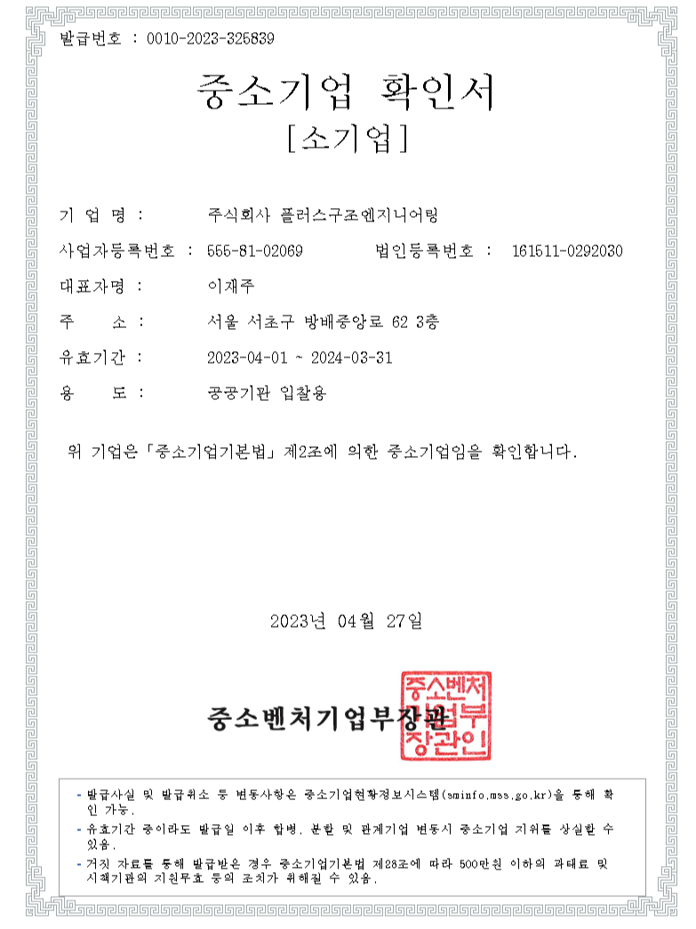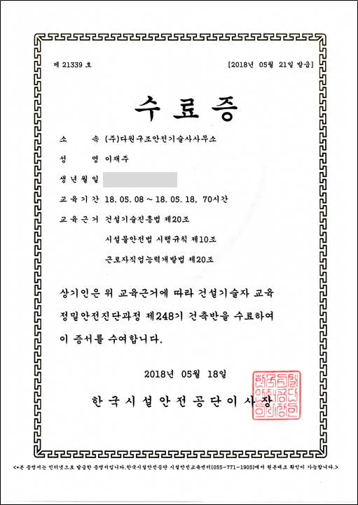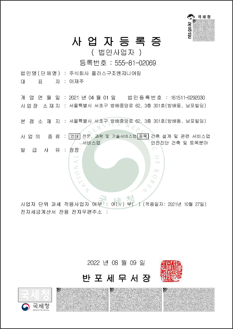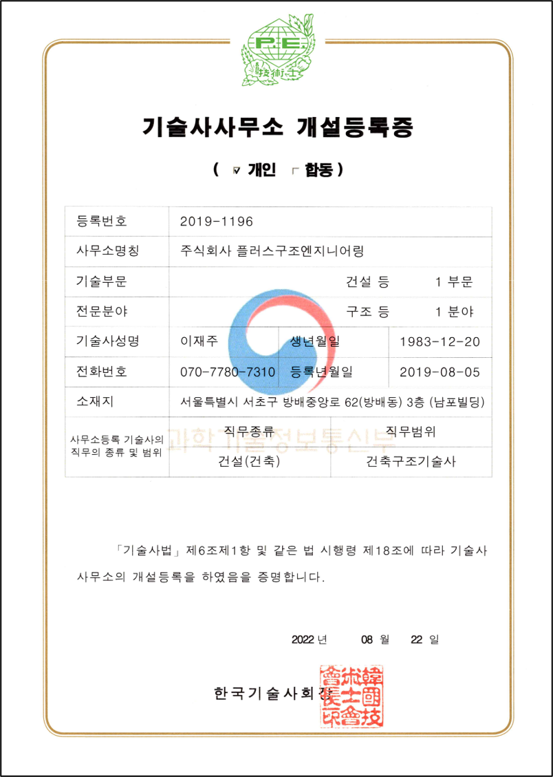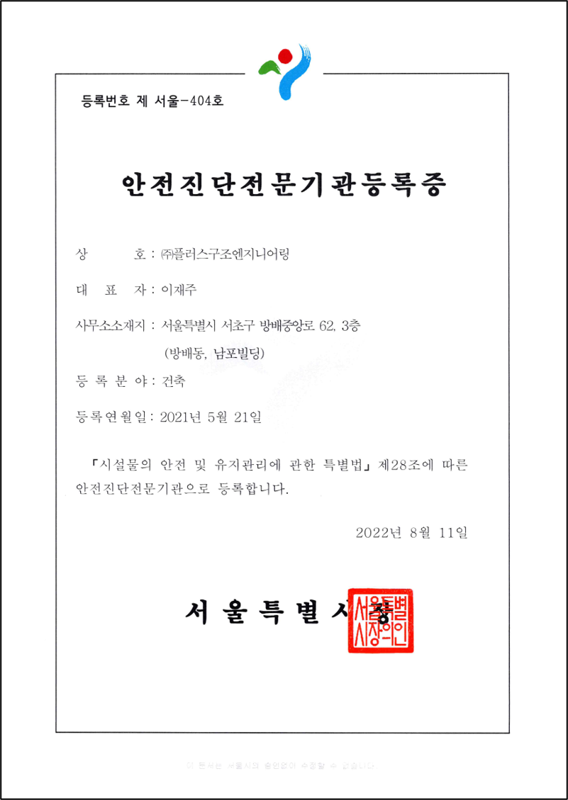 회사소개 면허 및 등록증 by 플러스구조엔지니어링 2020. 10. 18. 1. 면허 등록증 기술사사무소 개설등록증 안전진단전문기관등록증 2. 자격증 사본 (건축구조기술사) 3. 사업자등록증 4. 확인서 창업기업 확인서 중소기업 확인서 5. 수료증 정밀안전진단교육 수료증 해체공사 감리교육 이수증 공유하기 게시글 관리 플러스구조엔지니어링 저작자표시 (새창열림) '회사소개' 카테고리의 다른 글 안전진단보유장비 (0) 2021.05.08 인사말 (0) 2019.12.29 관련글 안전진단보유장비 인사말 댓글